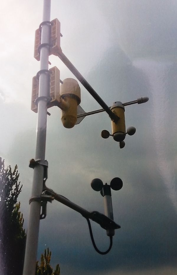 Die Sensoren sind einem 2,5 m langen Mastrohr direkt am frei stehende Giebel der Werkstatt montiert. Das Schalenkreuzanemometer für die Aufnahme der Windgeschwindigkeit überragt den Dachfirst um 1,40 m. Bezogen auf die Erdoberfläche ergibt das eine gesamte Höhe von 5,84 m (Abb.1). Die übliche Messhöhe beträgt 10 m. Hier ist also noch etwas Nacharbeit nötig. Zunehmend häufiger entdecken die Amseln und Spatzen den Feinstaubsensor als Bühne für ihre Gesänge und schmutzen ihn entsprechend ein - Natur pur.In Abb.3 ist ein zusätzlicher Sensor der Fa. Lambrecht zu erkennen. Dieser diente dazu das Anemometer der WS2500 zu kalibrieren.
