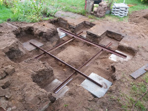 Quadratisches Streifenfundament auf Kiesbett mit einer Kantenlänge (außen) von 1 m und 0,4 m tief. Abstützung mit vier auslegern aus Winkelprofil mit einer Länge von je 2 m. Die Profile sind zur weiteren Stabilisierung gegen Kippmomente mit insgeasmt 24 Gehwegplatten (40x40) verschraubt.