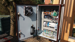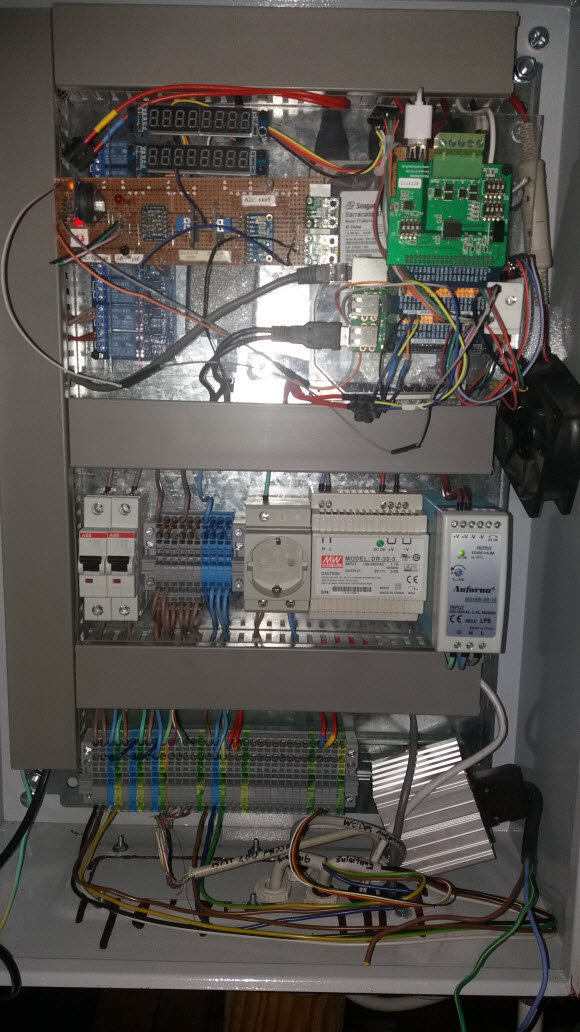 Wetterstationen die meinen Anforderungen an Meßgenauigkeit besonder hinsichtlich Windgeschwindigkeit entsprachen gab es nicht, also blieb der Eigenbau. Im Schaltschrank ist ein Kleinstrechner (RaspberryPi = RBPi) für die Erfassung, Bearbeitung und Speicherung der Messwerte in einer MySQL-Datenbank (mariadb) untergebracht.