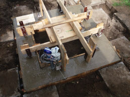 Warum einen Betonmischer leihen, wenn es auch anders geht Prototyp aus Säulenbohrmaschine, Oberfrästisch, Maurerkübel und Feuerkorb. Als Plan B lag Vater's alte Metabo bereit - kam aber nicht zum Einsatz. Der improvisierte Micher hat tatsächlich funktioniert.Die 8 Betonanker sind mit einem Winkel von 87° bereits in die Verschalung integiert, Das Leerrohr für 230 V, LAN, und Datenkabel ist auch schon im Fundamentbereich fixiert.